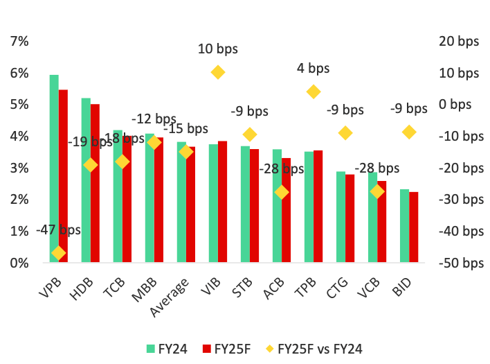 Dự báo biên lãi ròng (NIM) trung bình của các ngân hàng sẽ giảm 15 điểm cơ bản (bps) so với cùng kỳ trong năm 2025. Nguyên nhân chủ yếu đến từ chi phí vốn tăng nhanh hơn lợi suất tài sản sinh lãi (IEA).Về phía chi phí vốn, mặt bằng lãi suất huy động – đặc biệt là kỳ hạn ngắn tại các ngân hàng tư nhân – đã liên tục tăng kể từ năm 2024. Dù có dấu hiệu ổn định trong quý 1/2025, xu hướng tăng vẫn có thể tiếp diễn do: (1) nhu cầu vốn lớn nhằm phục vụ tăng trưởng tín dụng, và (2) tỷ lệ LDR tại nhiều ngân hàng đã tiệm cận ngưỡng trần theo quy định.