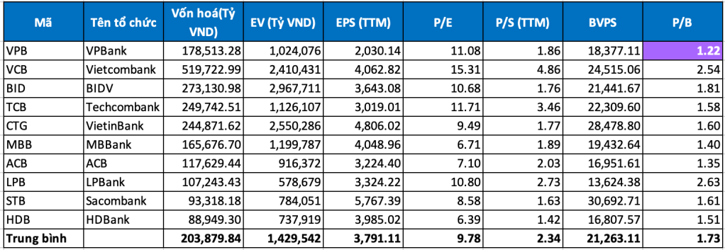 VPB đang giao dịch ở mức P/B quanh 1.2 lần, thấp hơn nhiều so với mức 1.7x của trung bình ngành và thấp hơn mức P/B trung bình của cổ phiếu trong 5 năm qua. Kết thúc quý 2, giá trị sổ sách của VPB đang ở mức 19,181đ/cp, kết hợp với P/B trung bình 1.5, gía trị hợp lý của VPB sẽ ở mức 28,772đ/cổ phiếu.
