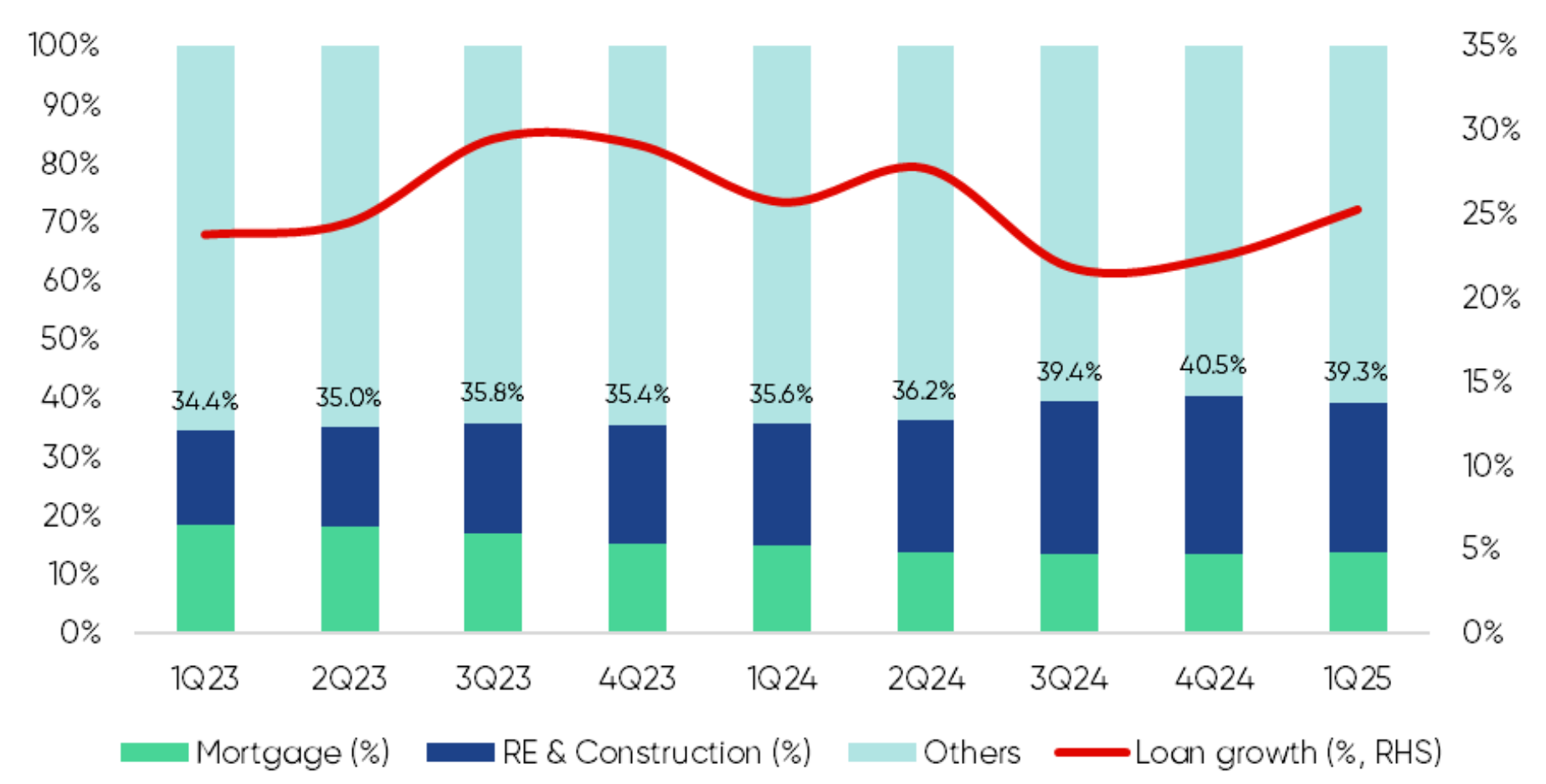 Cho vay lĩnh vực “RE & Construction” (BĐS & Xây dựng) tăng dần qua các quý, từ 34.4% ở Q1/23 lên 39.3% ở Q1/25, điểm cao nhất là 40.5% ở Q4/24. => Thể hiện cho vay lĩnh vực bất động sản & xây dựng, nhất là từ nửa cuối 2024 đang có sự cải thiện. Mortgage (Cho vay mua nhà) giữ tỷ trọng khá ổn định (~15-18%). Theo thông tin FTD được biết, VPBank là một trong những ngân hàng tham gia sâu vào hoạt động mở bán các dự án căn hộ mới ở Bình Dương, điển hình là La Pura của Phát Đạt với tỷ lệ hấp thụ rất tốt thời gian gần đây.