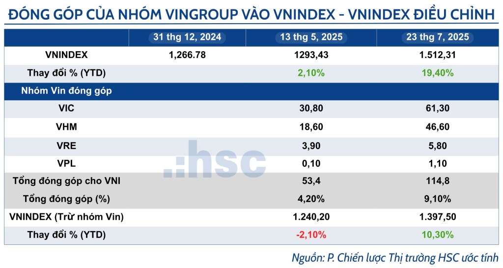 Tính đến ngày 23/07/2025, chỉ số VN-Index đạt 1,512.31 điểm, tăng mạnh 19.4% so với cuối năm 2024. Tuy nhiên, một phân tích kỹ hơn về đóng góp của các cổ phiếu lớn trong rổ chỉ số cho thấy mức tăng này phần lớn đến từ nhóm cổ phiếu thuộc Tập đoàn Vingroup (gồm VIC, VHM, VRE và VPL), thay vì là sự cải thiện đồng đều trên toàn thị trường.