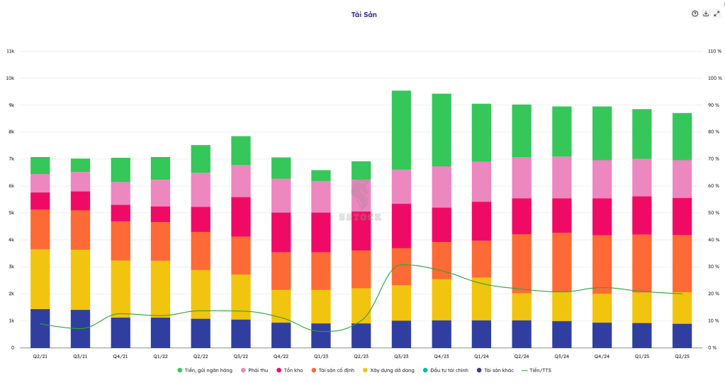Tại thời điểm Quý 2 2025, CEO đang giữ lượng tiền mặt 1.744 tỷ (chiếm 20% vốn chủ sở hữu). Sử dụng đòn bẩy cực thấp khi Nợ/vốn chỉ 5,5% – thuộc nhóm lành mạnh nhất ngành BĐS.